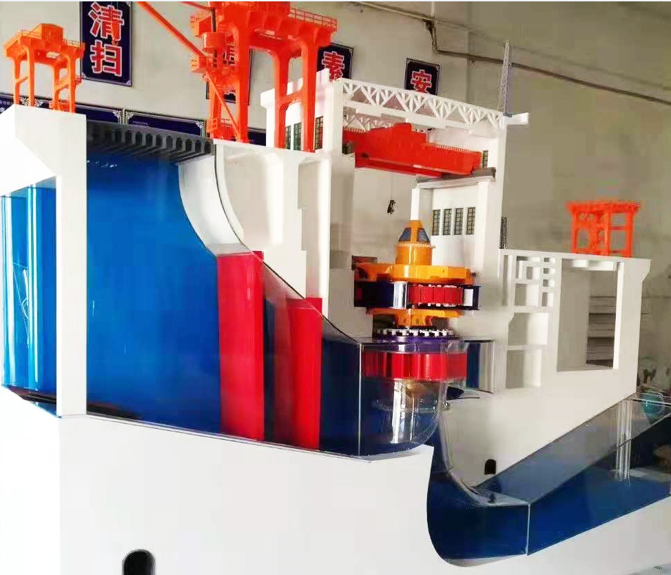 轴流式水轮机模型 轴流式转轮模型可分为定桨式和转桨式两种,它们的主要区别是转桨式转轮的叶片随导叶开度和水头的变化能自动调整叶片安放角,与导叶保持最佳的协联关系。在水轮机运行中,导叶必须按负荷调整开度,而转轮一边旋转一边调整叶片角度保持与导叶的最佳协联关系,即所谓“双重调节”,使水轮机在较大的出力范围内均保持较高的效率。定桨式转轮由于在运行中叶片不能调整,当机组负荷发生变化,导叶开度改变时,叶片安放角不能及时调整,水流对叶片冲角增大,所以在整个出力范围内水轮机的高效区很窄,但它的结构简单,在中小型电站中仍较多被采用。