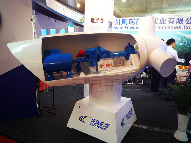 风力发电机舱模型:机舱包容着风力发电机的关键设备,包括齿轮箱、发电机。维护人员可以通过风力发电机塔进入机舱。机舱左端是风力发电机转子,即转子叶片及轴。