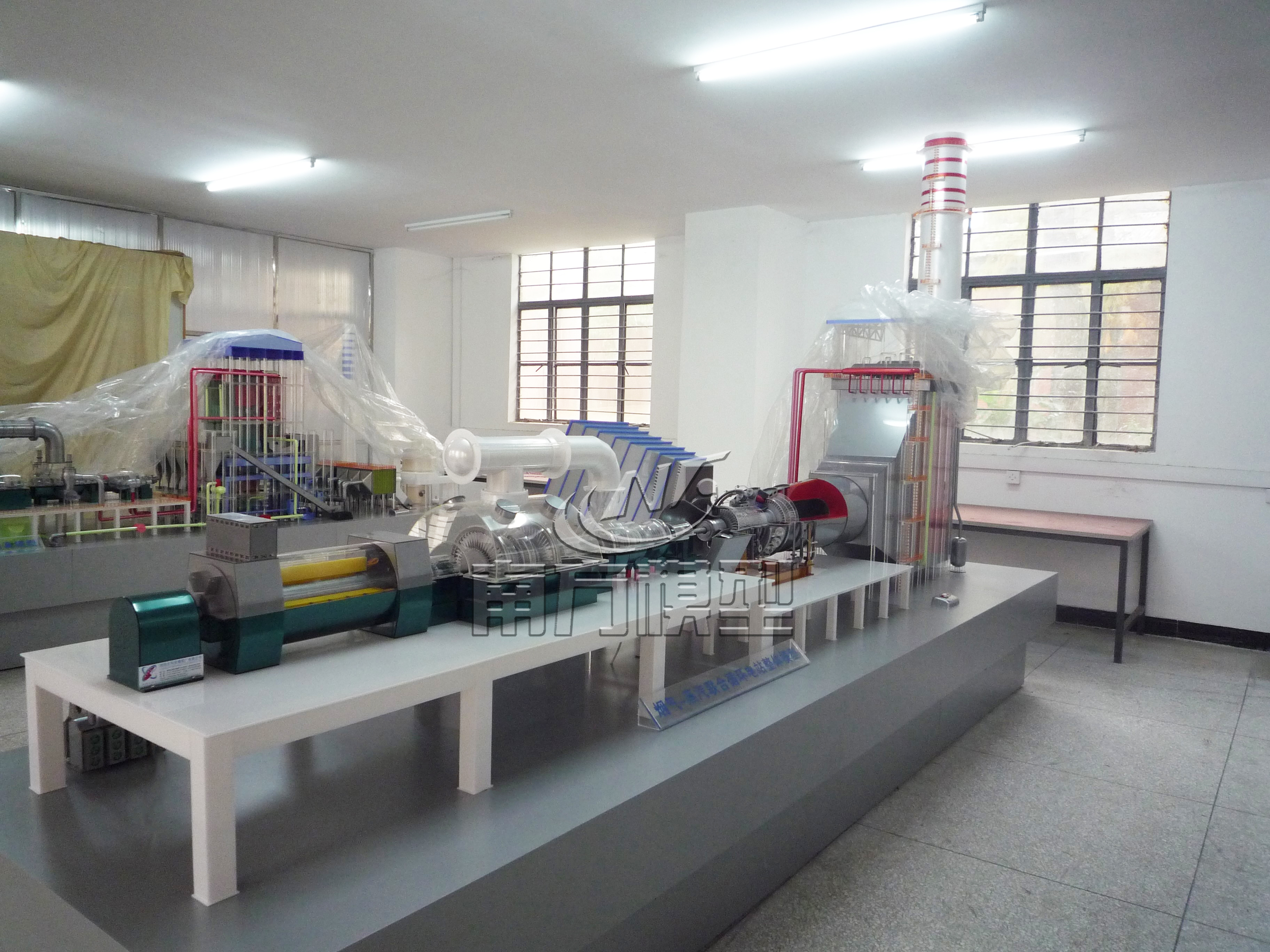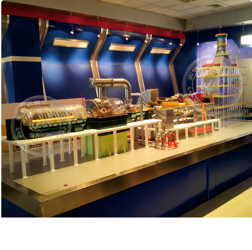 机组模型的展台采用35*35不锈钢方管制作骨架,表面上覆设1mm厚度304不锈钢板材,再以氩弧焊点焊焊接,整体焊接成型后稳如泰山,结构坚固。这个燃气-蒸汽联合循环发电机组模型工作电压为AC220V,用电功率仅为1kW。使用温度为-35℃~+50℃的恒温环境,展示出极强的环境适应性。当接通电源打开电源开关时,其核心部件包括余热锅炉、燃气轮机、蒸汽轮机和发电机,由它们共同构成的这个精密而高效的发电系统便运转起来,向观众展示整个机组的运行工作原理。电站运行过程:天然气经过加热后进入燃气轮机的燃烧室,与压气机压入的高压空气混合燃烧,瞬间产生的高温高压气流,推动着燃气轮机旋转做功。燃气轮机排出的高温气体,则进入余热锅炉,将水加热成高温高压蒸汽,这些蒸汽如同力量之源,驱动着蒸汽轮机旋转做功。燃气轮机、蒸汽轮机和发电机的转轴相互连接,通过旋转实现燃气轮机、蒸汽轮机同时推动发电机旋转发电的功能。完成了从热能到电能的转变。